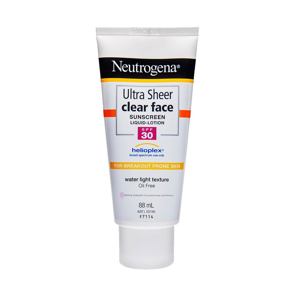 Neutrogena Ultra Sheer Clear Face Sunscreen Liquid-Lotion SPF 30 with Helioplex broad spectrum UVA/UVB is designed for acne prone skin, has a water light texture, for a non-greasy, matte finish and is oil free.