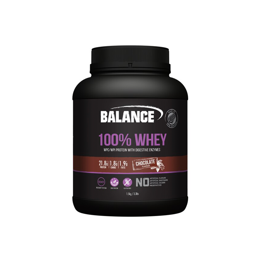 Balance 100% Whey is a high protein, gluten free blend with added digestive enzymes. It contains New Zealand sourced whey protein concentrate and whey protein isolate. The whey proteins have been produced by ultra-filtration to retain their natural state helping you meet the heavy demands of training. Whether your priority is building lean muscle, improving recovery or both, this superior tasting protein blend is scientifically developed to enhance your sports nutrition needs.