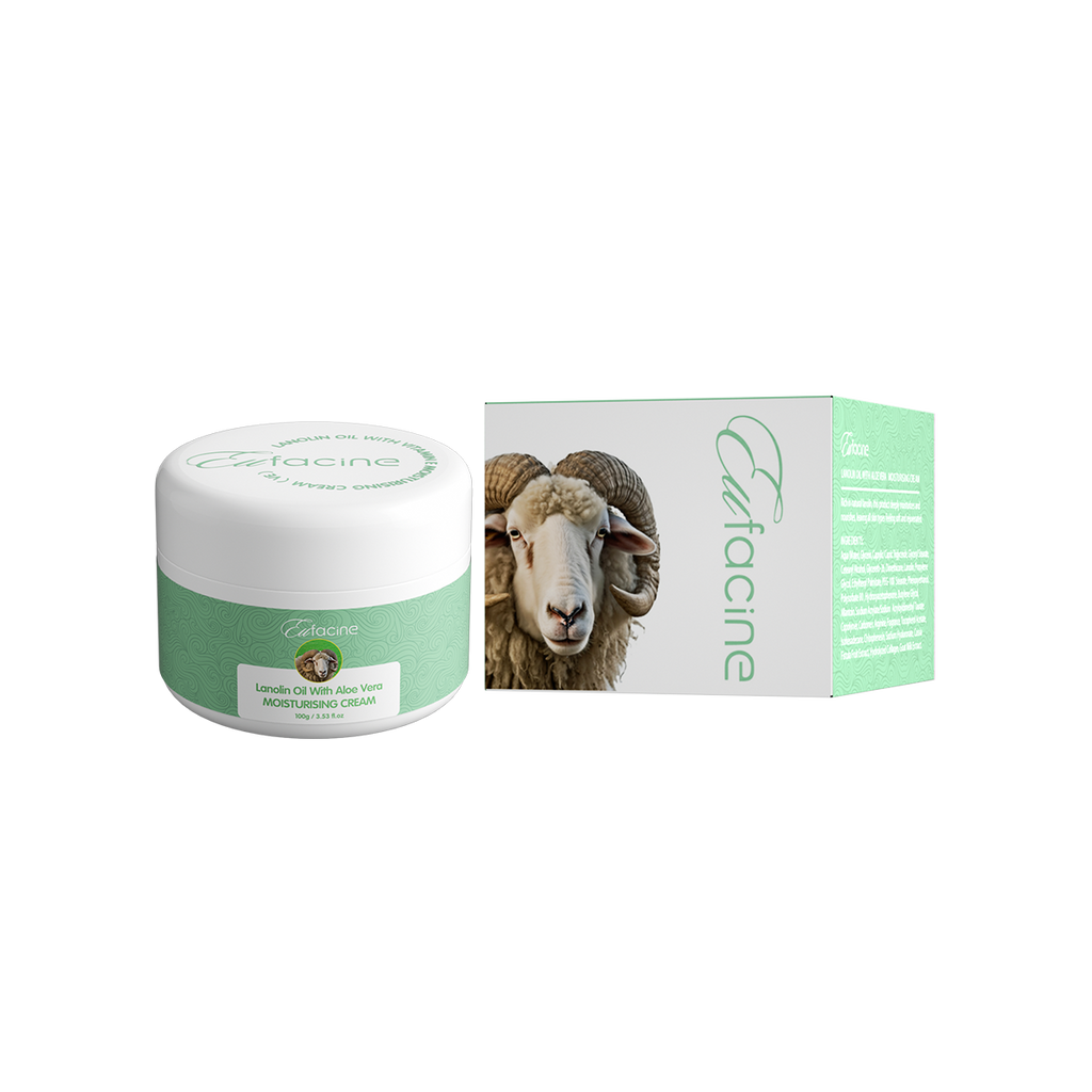 Eufacine Lanolin Oil with Aloe Vera Moisturising Cream 100g combines the natural soothing properties of aloe vera and the rich nourishment of lanolin to gently hydrate and soothe the skin.