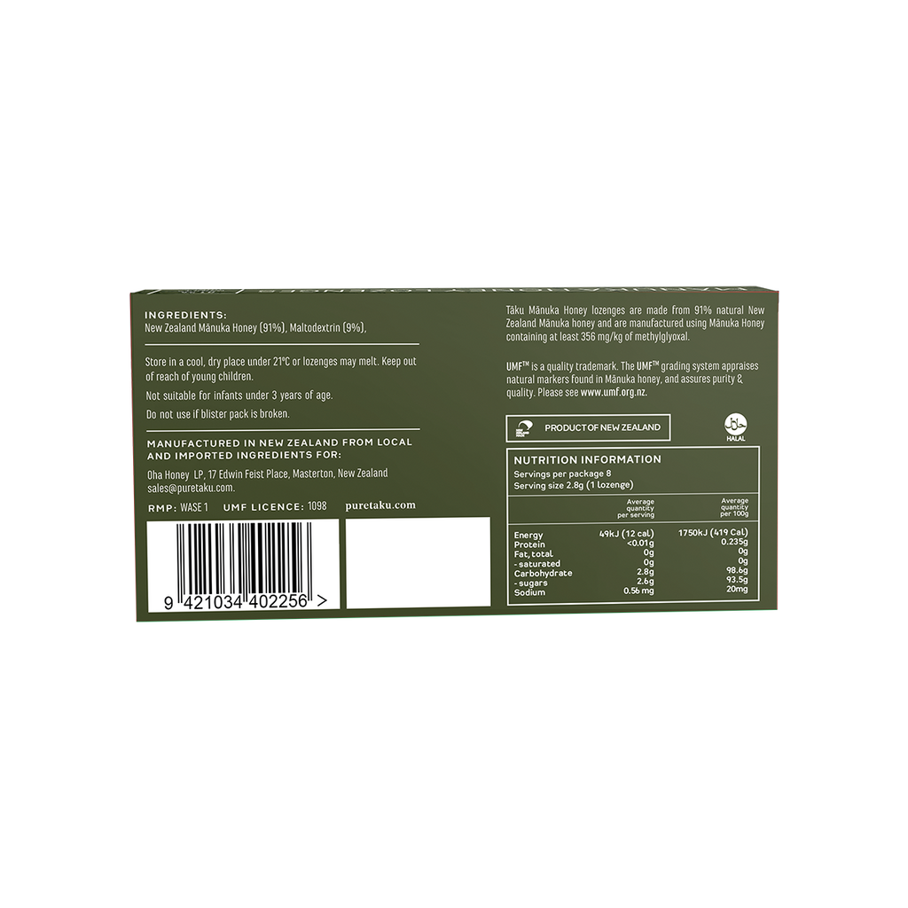 Taku Mānuka Honey Lozenges UMF™ 12+ MGO 356+ (8 Lozenges) combine the soothing properties of authentic New Zealand mānuka honey with convenient, on-the-go format. Made with 91% mānuka honey and certified to the UMF™ standard, these lozenges are perfect for calming the throat, supporting wellbeing, or simply enjoying a natural honey treat.