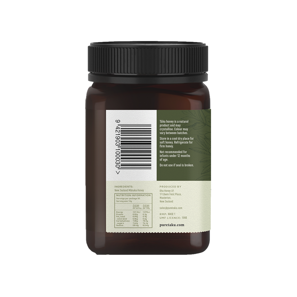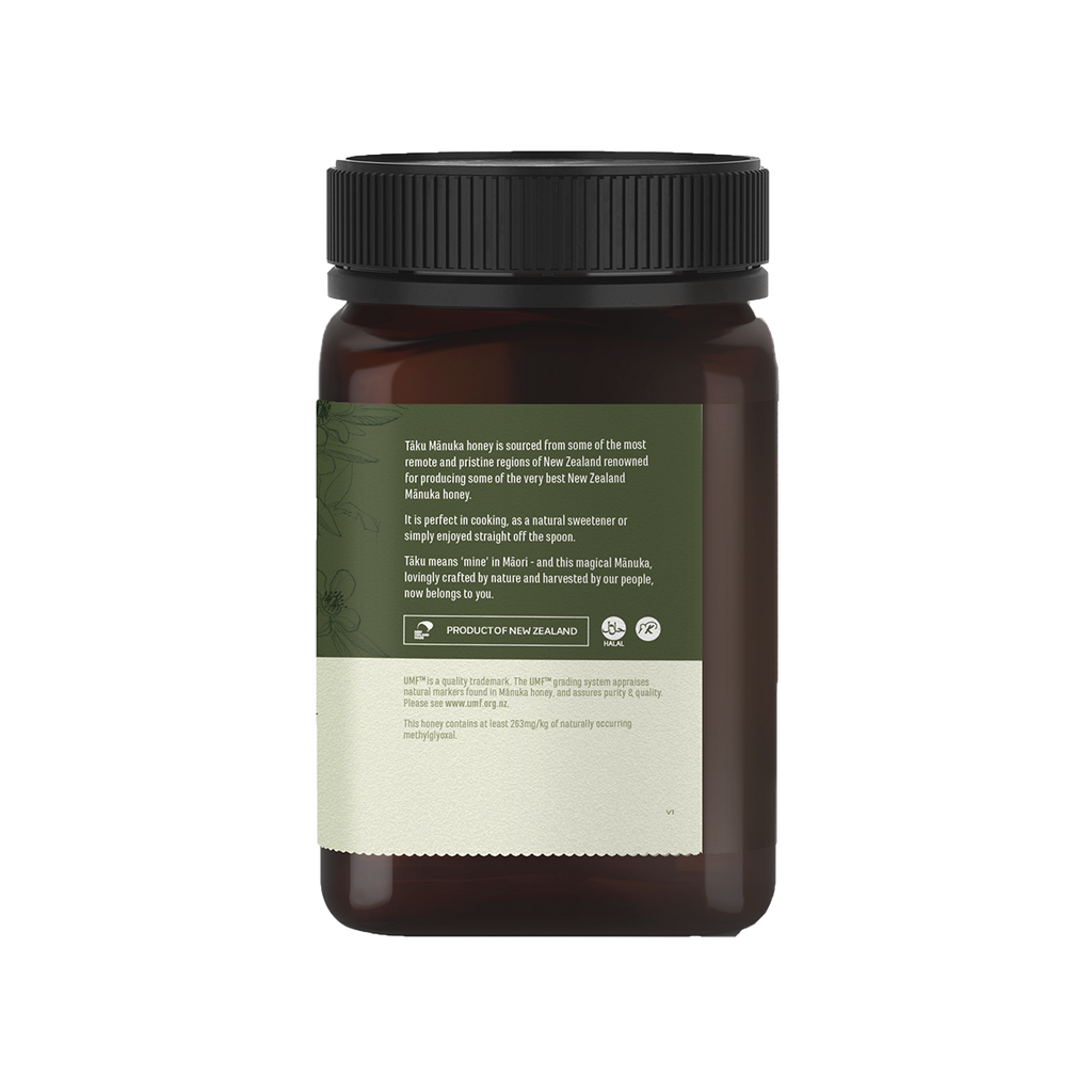 Taku Mānuka Honey UMF™ 10+ MGO 261+ 500g comes in a durable plastic bottle and is harvested from pristine New Zealand regions. Independently graded to the UMF™ standard, this monofloral mānuka honey contains at least MGO 261+. Enjoy its rich, complex taste by the spoon, in warm drinks, at breakfast, or in everyday cooking.