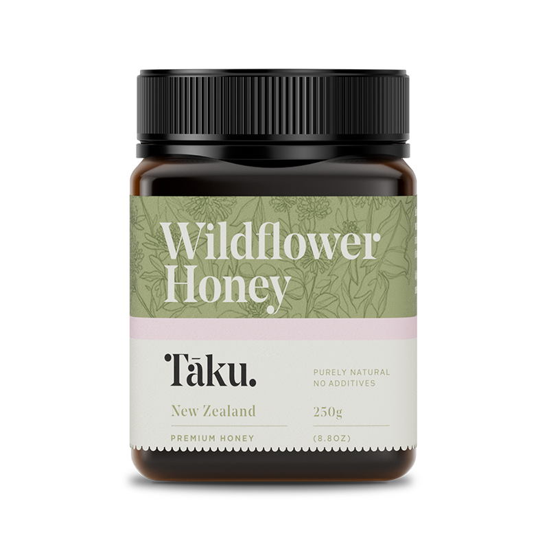 Taku Wildflower Honey (250g) is a pure, natural honey gathered by bees foraging amongst New Zealand’s abundant wildflowers after the mānuka flowering season. The result is a delicious golden honey with a flavour as vibrant and varied as the blossoms it comes from. With no additives or processing, this versatile honey is perfect as a natural sweetener, in drinks, or spread on toast.